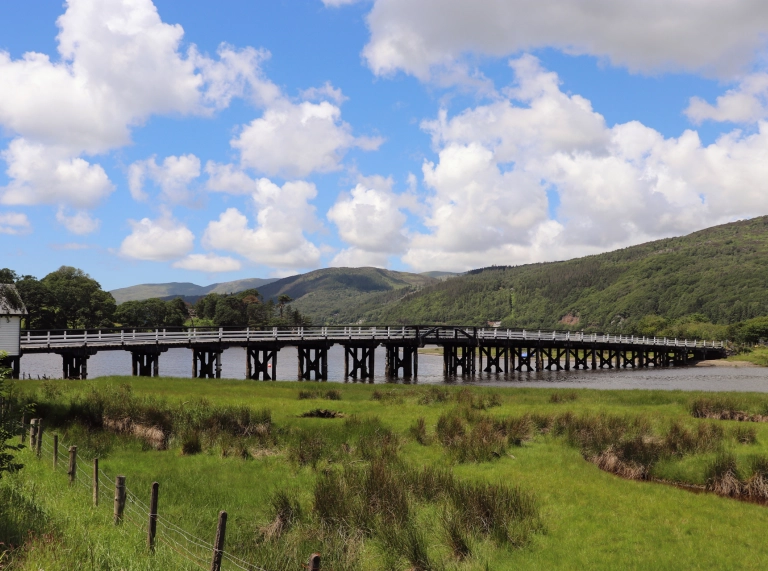 Half of the George III Hotel, sat on the banks of the Mawddach estuary, was once a ship-chandler’s workshop while the other half was a public house. The building probably dates from the middle of the seventeenth century. In those days, as you sipped your drink, you would be surrounded by seafaring activity and a buzzing ship building industry. Later, the trains of the Cambrian Railway would have roared passed, hissing their steam on their way from Dolgellau. Although the railway has long disappeared, the timber toll-bridge still stands over the estuary, as it has done since 1879.