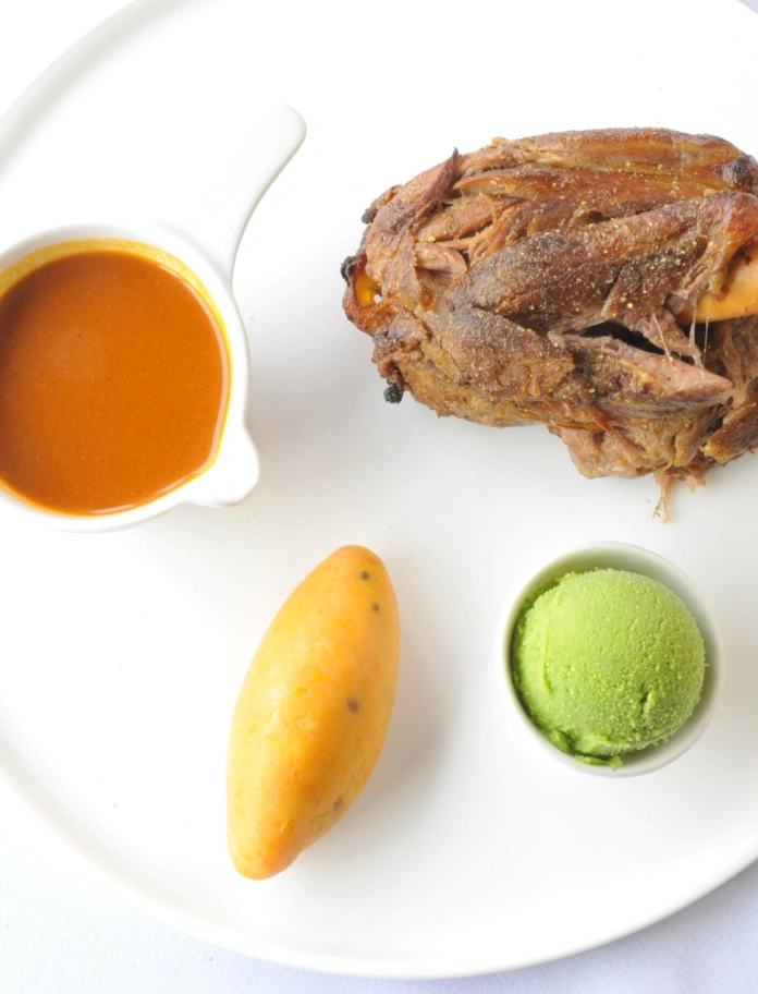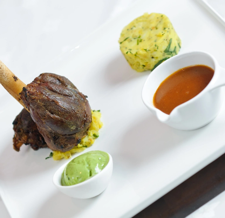 1. Preheat the oven to 250C, roast the lamb shank for 4-5 minutes, then lower the temperature to 180C and cook for another 4-5 minutes to make it crisp on the outside and still juicy inside. Baste it with clarified butter and chat masala.
