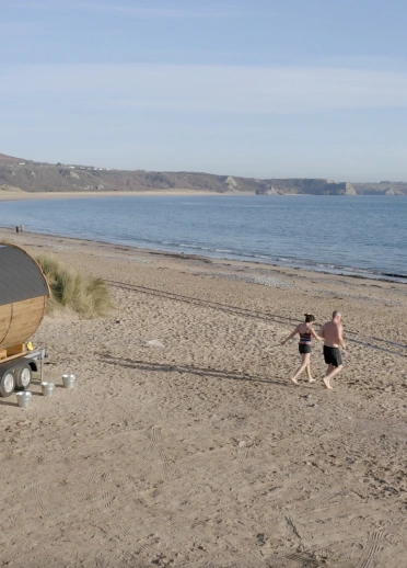 Traeth tywodlyd gyda sawna siâp casgen ar olwynion ar y tywod.