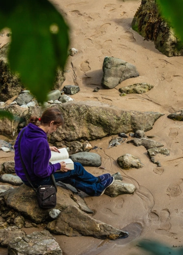 Menyw yn eistedd ar greigiau ar draeth, yn darllen llyfr.