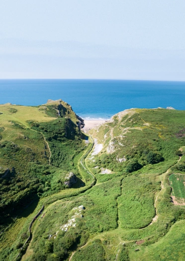 An aerial view of a valley, with a path leading to a small cove by the sea.