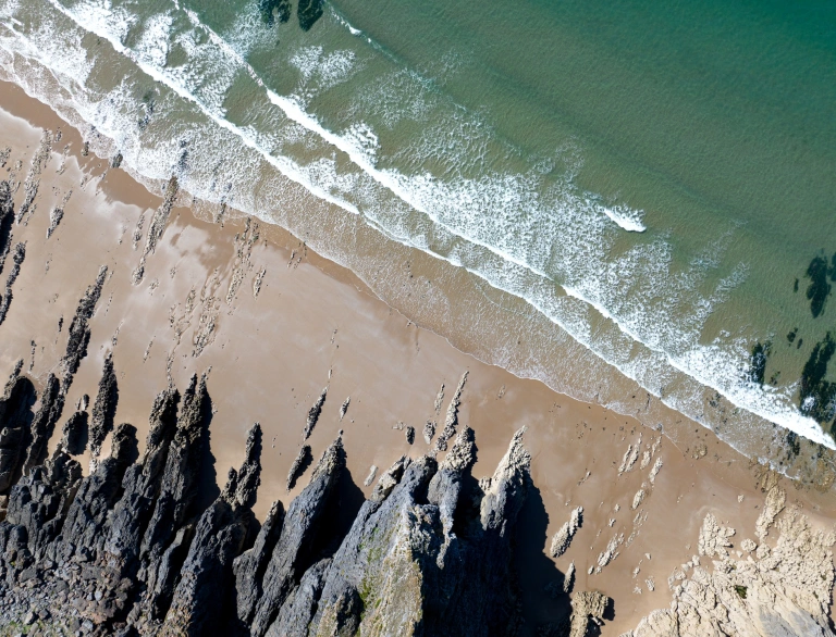 Traeth o’r awyr, gyda chreigiau, tywod a môr.
