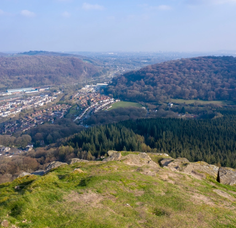 The view from a slate memorial on a hillside, looking over miles of rolling hills.