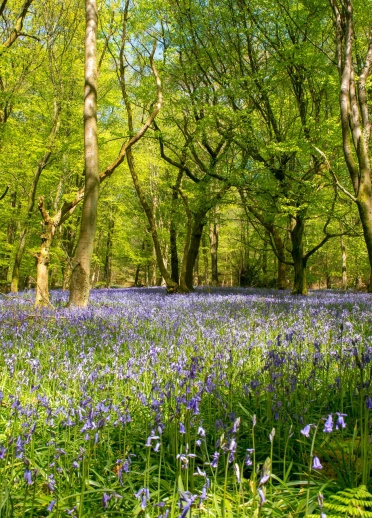 Coetir gyda chlychau'r gog yn carpedu'r ddaear.