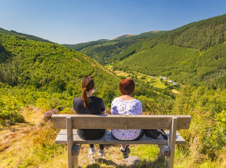 Two women sat on a bench overlooking a woodland sided valley and a small hamlet.