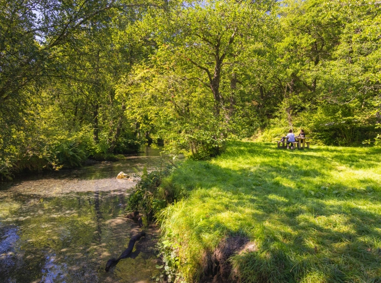 A shallow river in woodland, with a picnic bench on grass nearby.