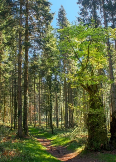 a woodland path through tall trees, on a sunny day.