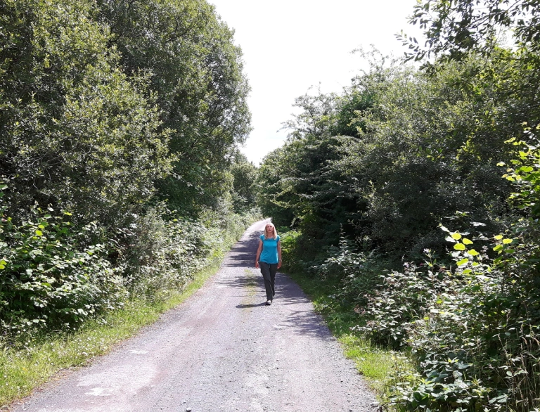 A woman walking along a gravelled path in woodland.