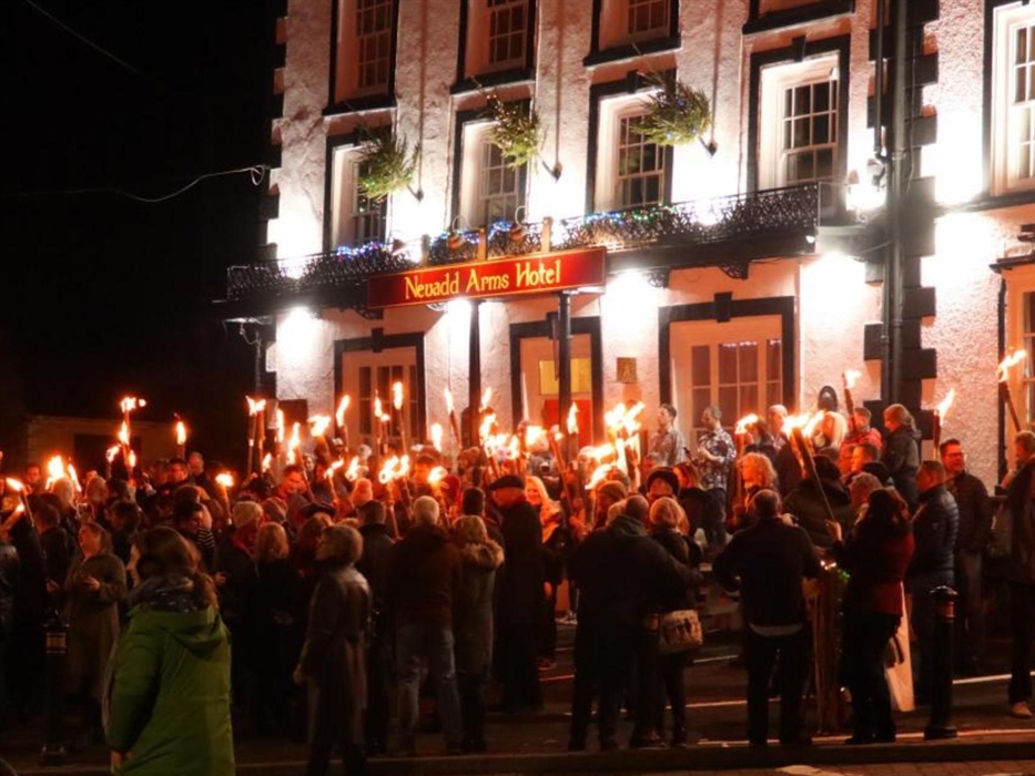 You are invited to take part in a short walk leaving the town square at 22:00 on New Year's Eve - there is no pre-entry - just turn up suitably dressed. Carrying burning torches to light the way, the procession follows the "Mari", a decorated horse's skull carried on a pole by the leader, to the Abernant Lake Hotel on the outskirts of town. Here there is a re-enactment of the ancient Welsh tradition of "Mari Lwyd", where there is an exchange of challenges and banter in verse between the bearer of the "Mari" and the occupants, in an endeavour to gain admission and refreshment.