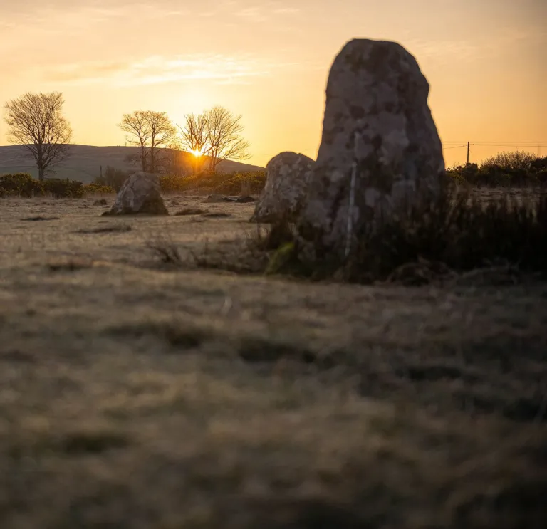 Pentre Ifan again Neolithic (New Stone Age) times the capstone stand precariously balanced on three ‘uprights’, though it has remained in place for over 5,000 years. Pentre Ifan’s sense of mystery is heightened by its surroundings and backdrop. Its outline neatly frames the Preseli Hills towering above, source of the famous Pembrokeshire ‘bluestones’ that went into the making of Stonehenge as well as Pentre Ifan itself. During the spring equinox, the site becomes even more enchanting as the sunset casts a warm glow over the ancient stones, adding to the mystical atmosphere.