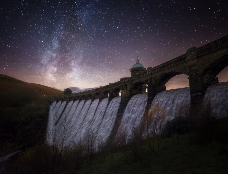 Popular with stargazers and astro-photographers, the Elan Valley's Craig Goch Dam near Rhayader has easy parking. Stargaze from the dam itself or take the path on the east side of the reservoir to find stunning views of the night sky. Visit Cwm Elan/Elan Valley Visitor Centre - a designated International Dark Sky Park. About 12 miles from Rhayader, Claerwen Dam in the Elan Valley has a car park on the western side, and no through-traffic to worry about.
