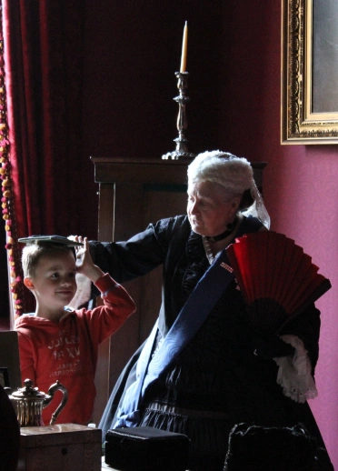 woman dressed in Victoria costume holding book onto of a boy's head.