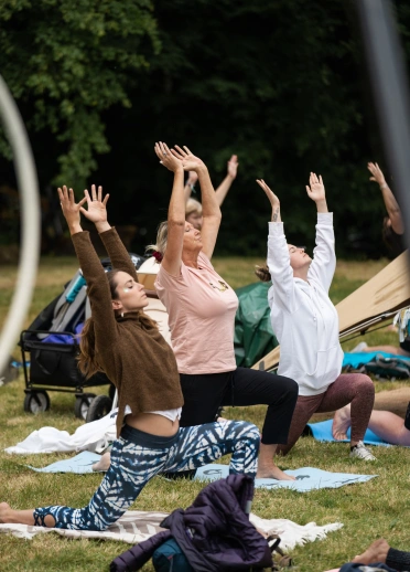 Three people in yoga poses, kneeling on one knee and reaching above their heads.