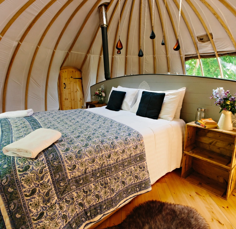Now for some really different options. At the award-winning Willows campsite on North Wales’ Llŷn Peninsula, you can stay in a fully-insulated Hobbit Tent that resembles a circular wooden tube. Family-run Penhein Glamping in the beautiful Wye Valley offers Persian 'alachighs' – tents with high domed ceilings, comfy beds (proper ones) and wood-burning stoves to keep you cosy.