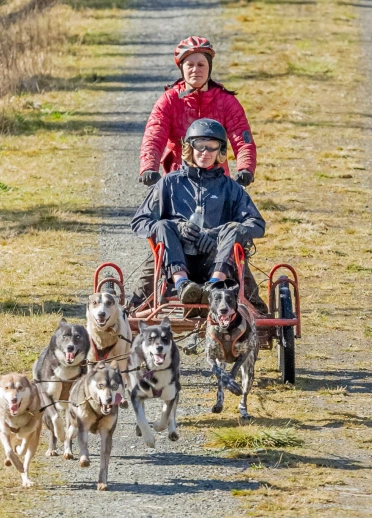 There's no need to hold out for snow. Through the cooler months of the year, from October through to May, you can take an exhilarating husky ride as a passenger with Joe and a 6-dog team, or you can take on the introduction to mushing experience and learn to ride a dryland sled or race 'rig' with your own 1 or 2-dog team.