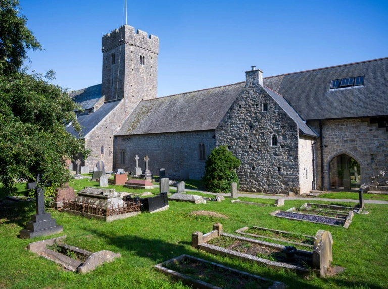 Exterior view of St Illtyd's Church with blue skies and graves outside