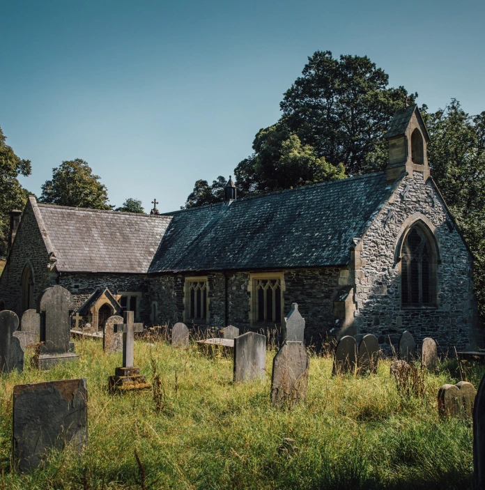 Llantysilio Church occupies high ground just north of the Horseshoe Falls. Originally a small chapel built around 1254, the church was restored by the Victorians in 1869. Inside are a rare medieval oak eagle lectern and two small 15th century stained glass figures incorporated into the later north window.
