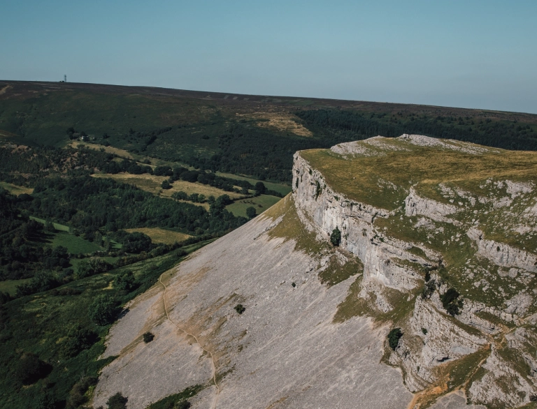 You can lengthen your walk to take in the impressive limestone Eglwyseg Escarpment, visible as a white scar on the landscape for much of the route. It was formed some 350 million years ago in a warm, shallow tropical sea teeming with life, which you can now see as fossils. The screes have accumulated since the end of the last Ice Age, some 11,000 years ago, as millions of angular pieces of rock have been dislodged by frost.