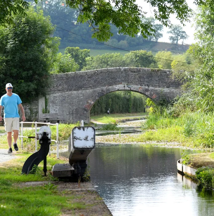 View from a canal lock towards a bridge over the water with two people walking along the canal.