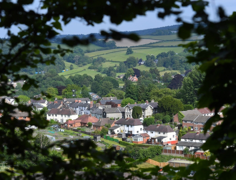 Trail in Machynlleth and a view overlooking Machynlleth on Glyndŵr's Way, Mid Wales