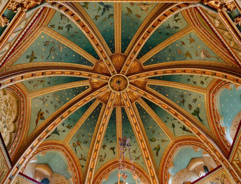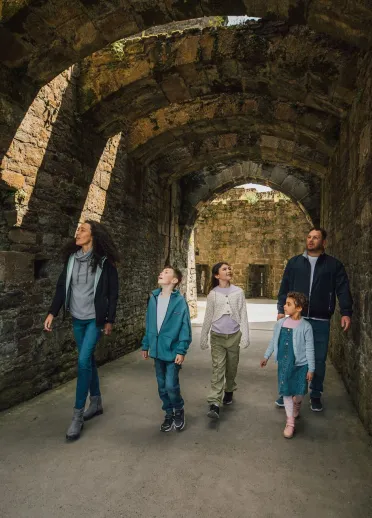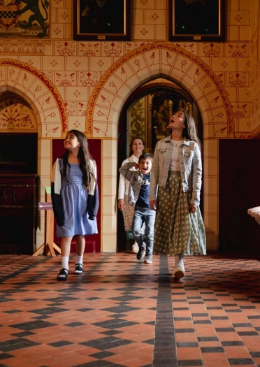 Mum and two children looking amazed at the opulent ceiling of an ornate room in a castle