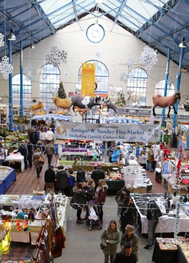 market stall with bric a brac in the foreground and other stalls and decorations on the ceiling.