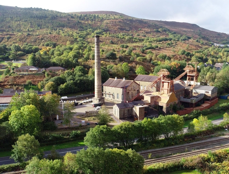 elevated view of A Welsh Coal Mining Experience, Rhondda Heritage Park and surrounding coutryside.