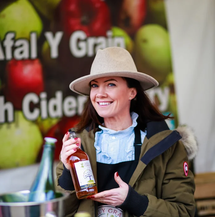 Menyw yn gwisgo het ac yn dal potelaid o seidr