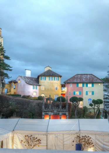 Golygfa fin nos o bebyll y ffair grefft ym Mhortmeirion.