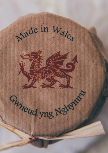 Label on top of a honey jar. Text says 'Made in Wales'.