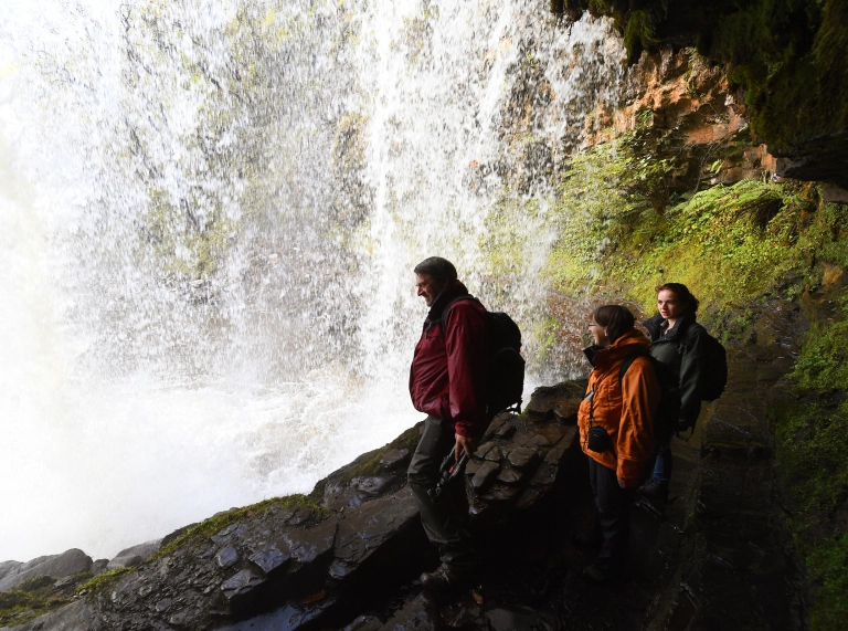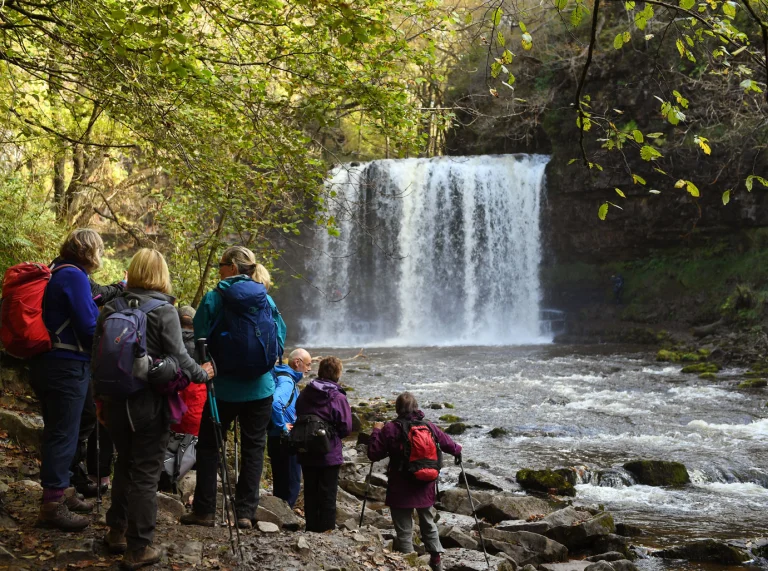 Group of walkers admiring Sgwd yr Eira waterfall