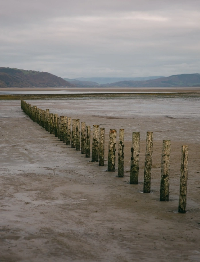 Morglawdd wedi'i wneud o byst pren mewn tywod ar lanw isel