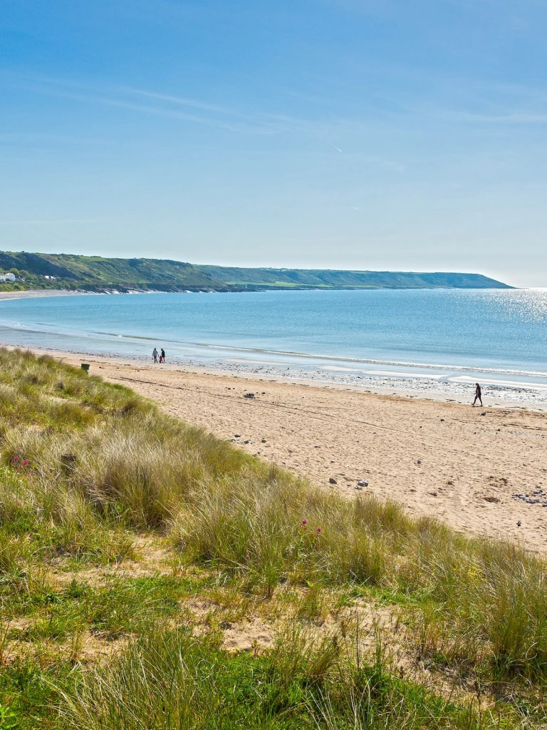 Hugely popular with those staying at the campsites nearby, this is a generous sweep of south-facing sand, dunes, pebbles and rock pools framed by attractive headlands. The pleasant village of Port Eynon offers ice cream, fish and chips and other treats, and the coastal path to Rhossili is one of Gower’s loveliest.